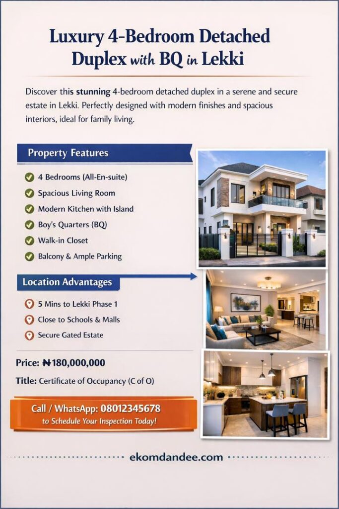 “Explore this modern 4-bedroom duplex for sale in Lekki Phase 1 featuring spacious interiors, secure parking, and premium finishes.”